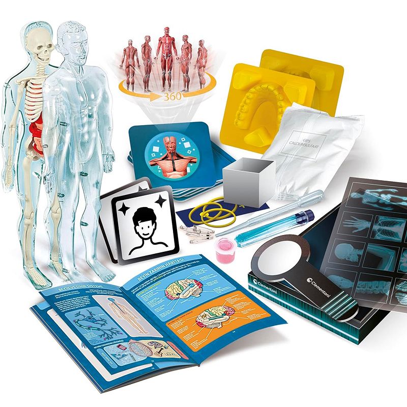 Zawartość zestawu: model ludzkiego ciała: narządy, szkielet, przezroczysta osłona, tablica anatomiczna, plansza RTG, okular, formy na odciski zębów, gips, farba plakatowa, taśma klejąca dwustronna, plastikowa kostka, pipeta