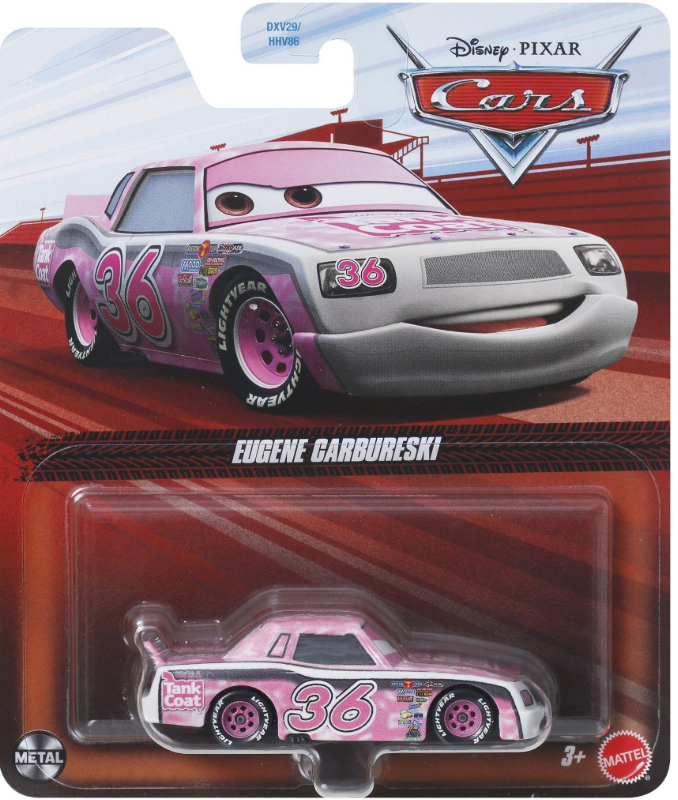 W opakowaniu znajdziesz różowy samochód z czarnymi ozdobami i numerem bocznym 36. Bolid imieniem Eugene Carbureski startuje dla zespołu Tank Coat, którego logo widoczne jest na masce i bagażniku.