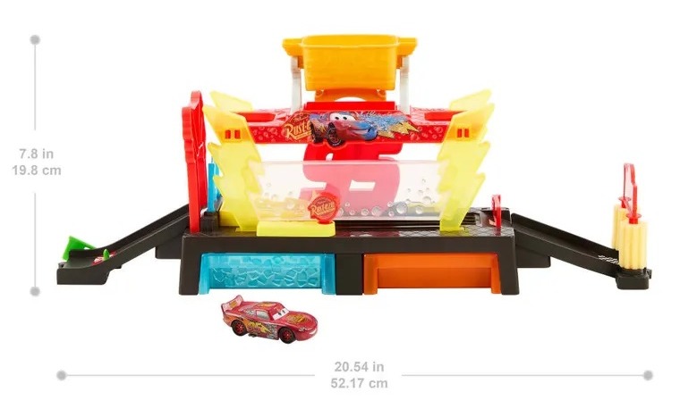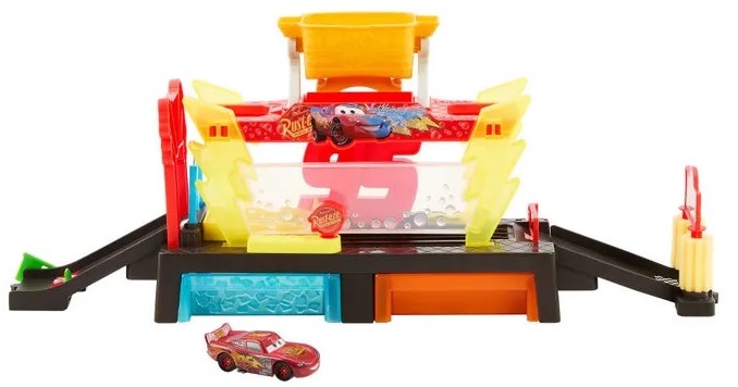 Zygzak McQueen musi błyszczeć na każdym wyścigu i prezentować się z najlepszej strony. Z zestawem myjni samochodowej szybko pozbędziesz się kurzu, piachu i innych zabrudzeń z autka. Wjedź dołączonym samochodzikiem do myjni i polej go bardzo ciepłą wodą ze Złotego Tłoku, aby aktywować zmianę koloru. Popędź do mety i ku kolejnemu wyścigowi.