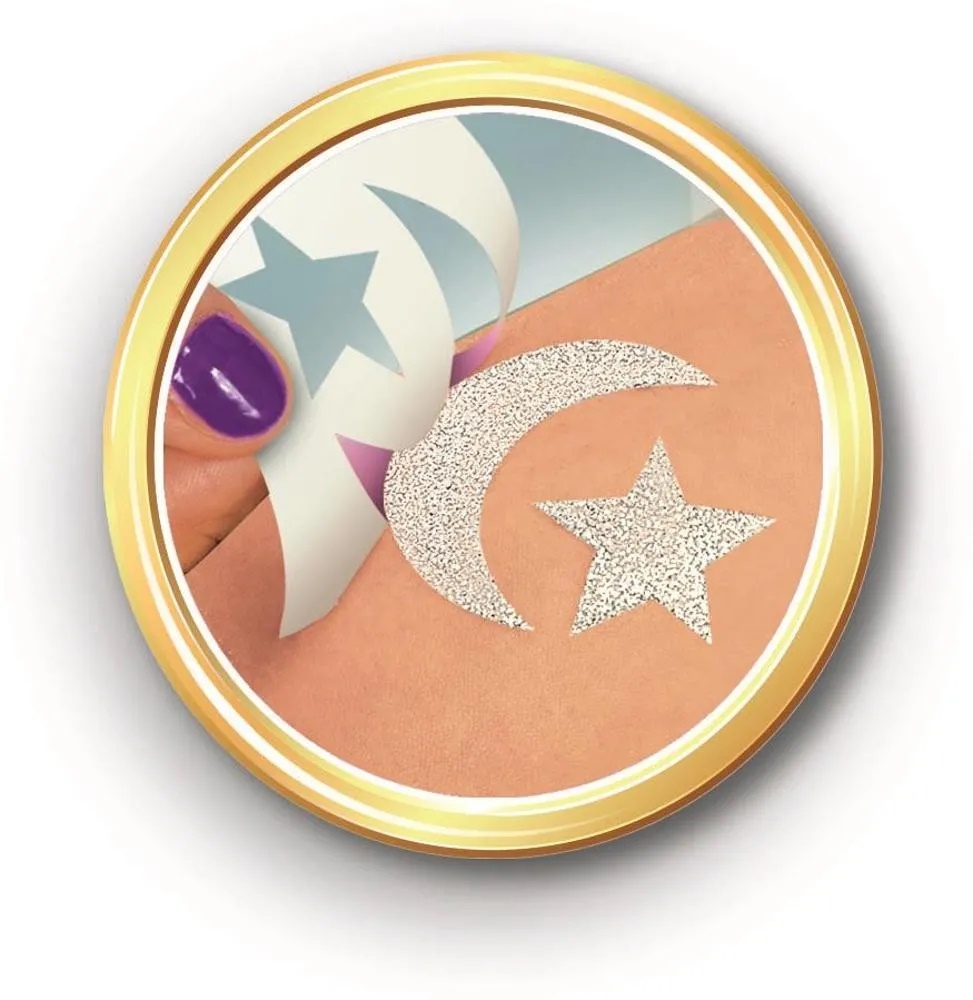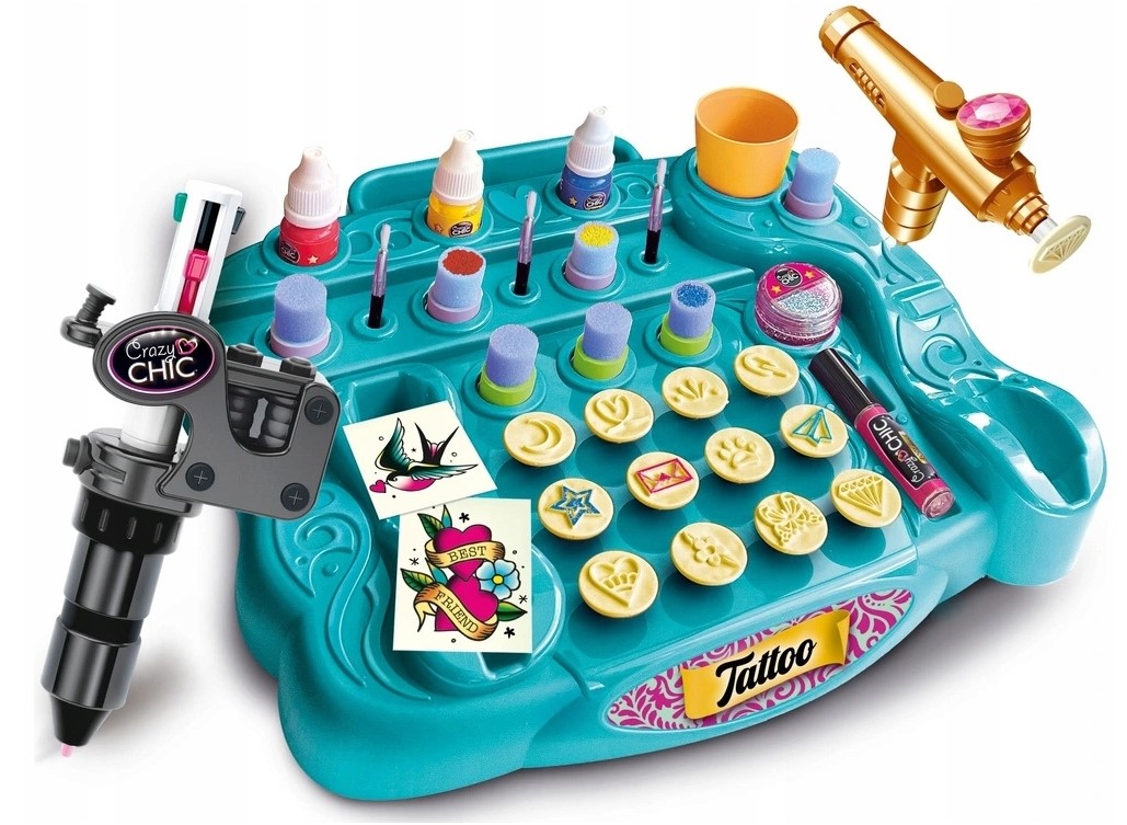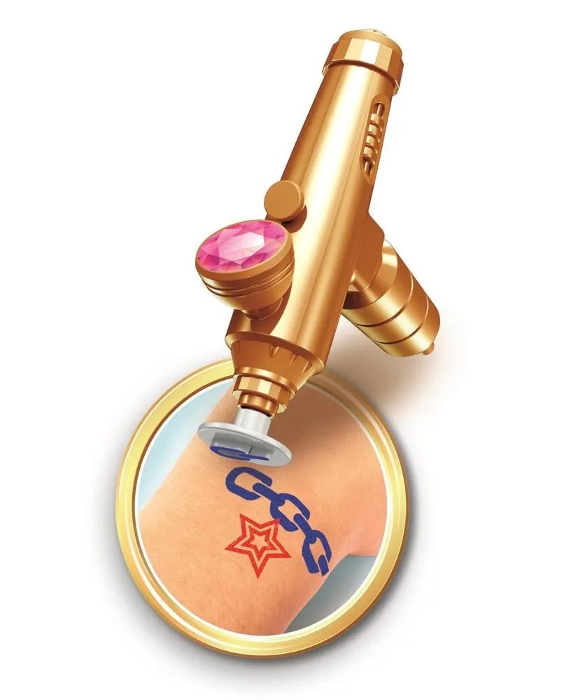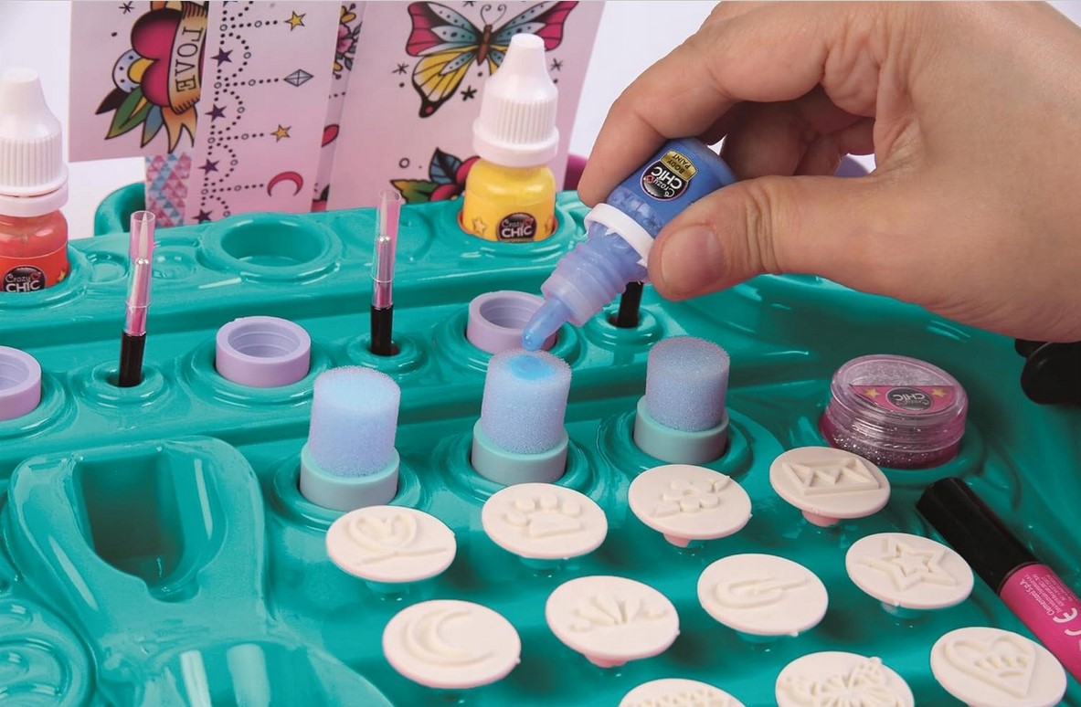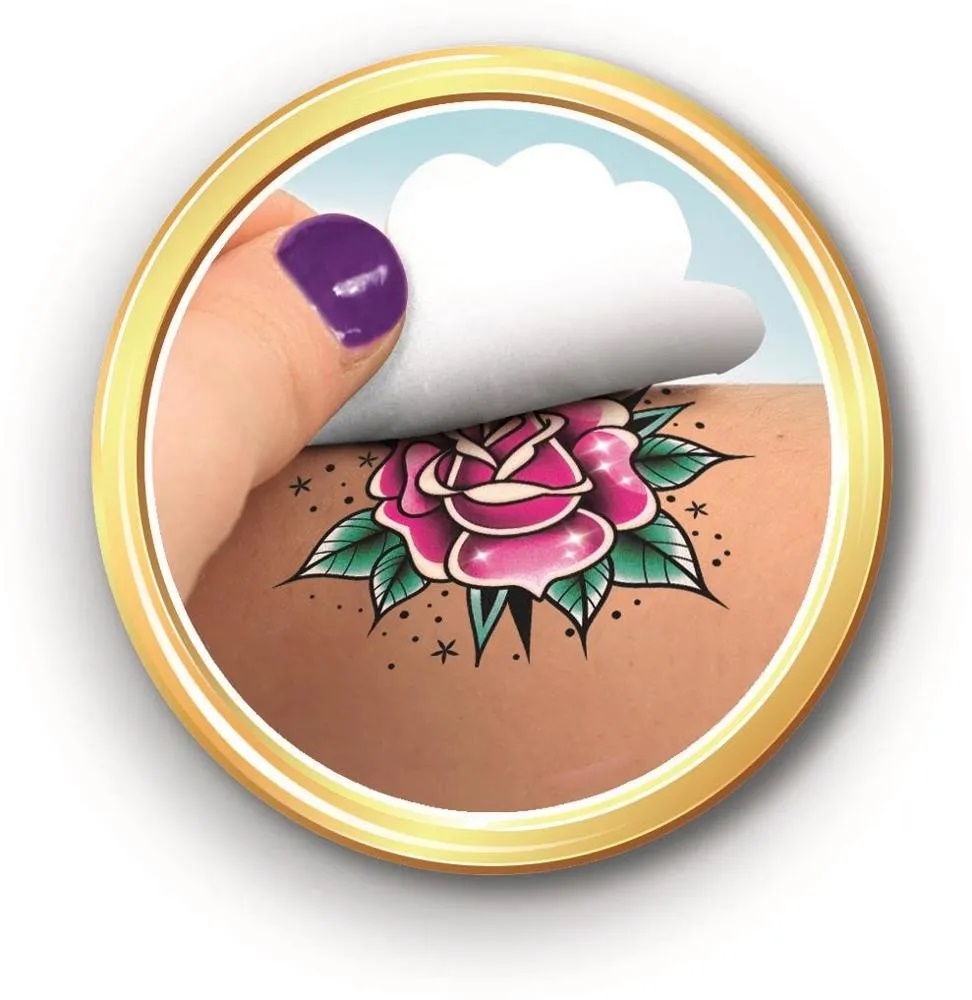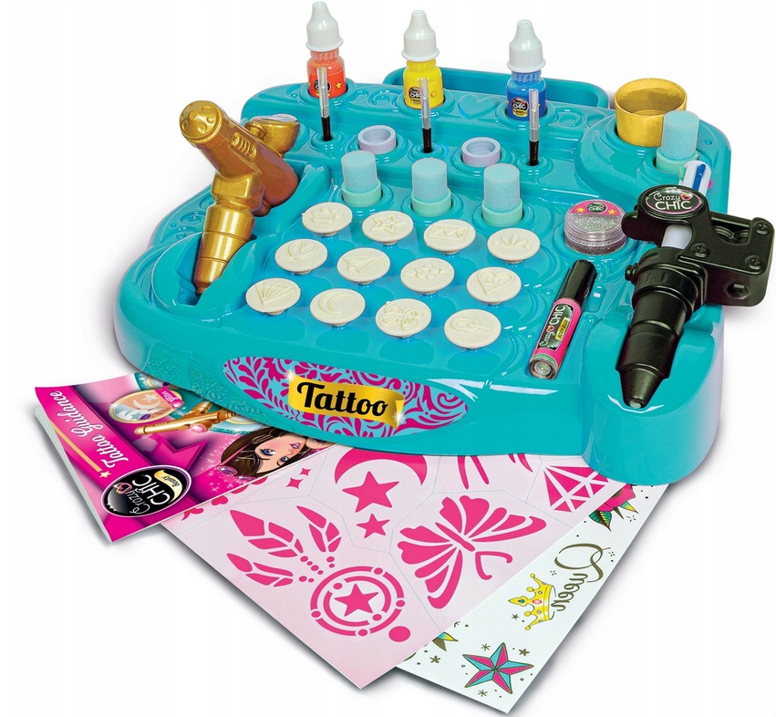 Studio Tatuażu to ciekawy zestaw dla miłośników sztuki dekoracyjnej, pozwalający eksperymentować z różnymi technikami w jednym zestawie. Dwa specjalne narzędzia do nakładania tatuaży ręcznie lub za pomocą samoprzylepnych szablonów lub wymiennych szablonów. Konsola, która pozwala natychmiast rozpocząć pracę nad wzorami i technikami, aby tworzyć wyjątkowe i niezwykle spersonalizowane tatuaże. Oddzielna technika dla każdego stylu i specjalne narzędzia do jej wykonania, dzięki czemu dzieci mogą swobodnie wyrażać swoje artystyczne umiejętności z maksymalną precyzją. Dzięki oryginalnemu pisakowi do ciała z 4 wymiennymi kolorowymi końcówkami małe dziewczynki mogą bawić się, tworząc własne spersonalizowane tatuaże, rysując je ręcznie lub za pomocą szablonów.