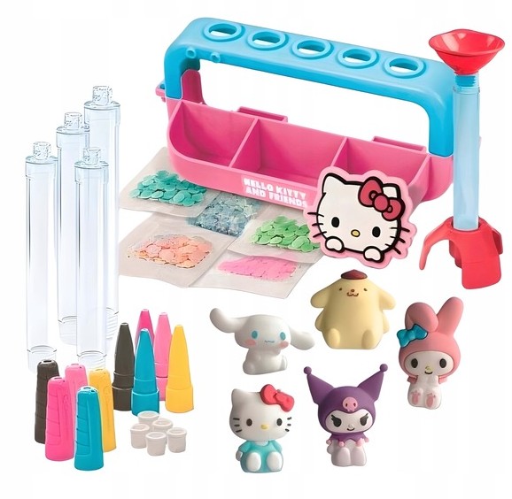 Dzięki specjalnej konsoli i bogatemu zestawowi akcesoriów dziecko może stworzyć własne, niepowtarzalne długopisy wypełniając je brokatem, koralikami i ozdobami oraz wykańczając figurkami Hello Kitty i jej przyjaciół.