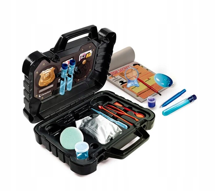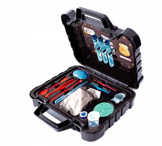 Solidna, przenośna walizeczka kryje w sobie bogate wyposażenie inspirowane pracą profesjonalnych detektywów i laboratoriami kryminalistycznymi. To doskonałe połączenie zabawy, nauki i logicznego myślenia.
