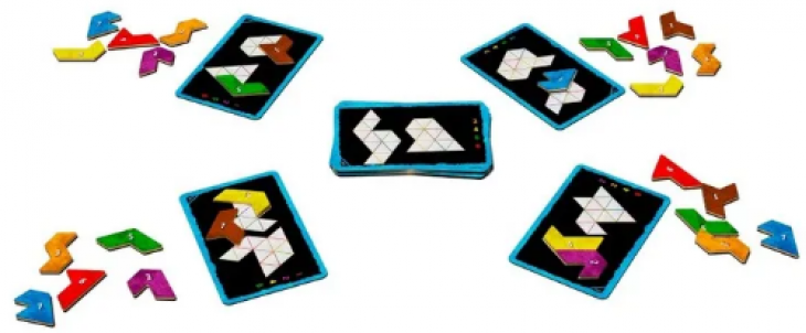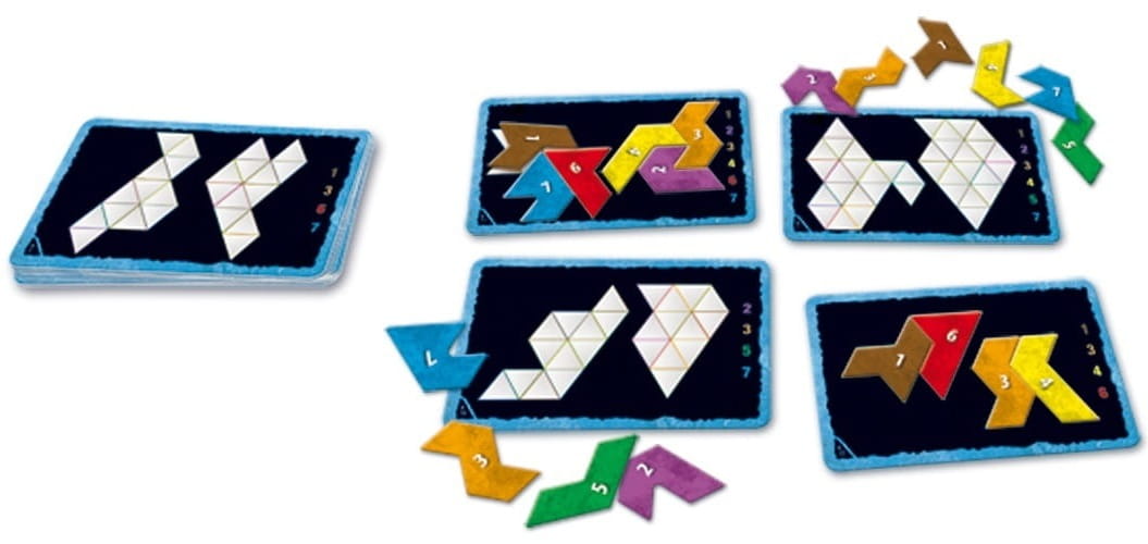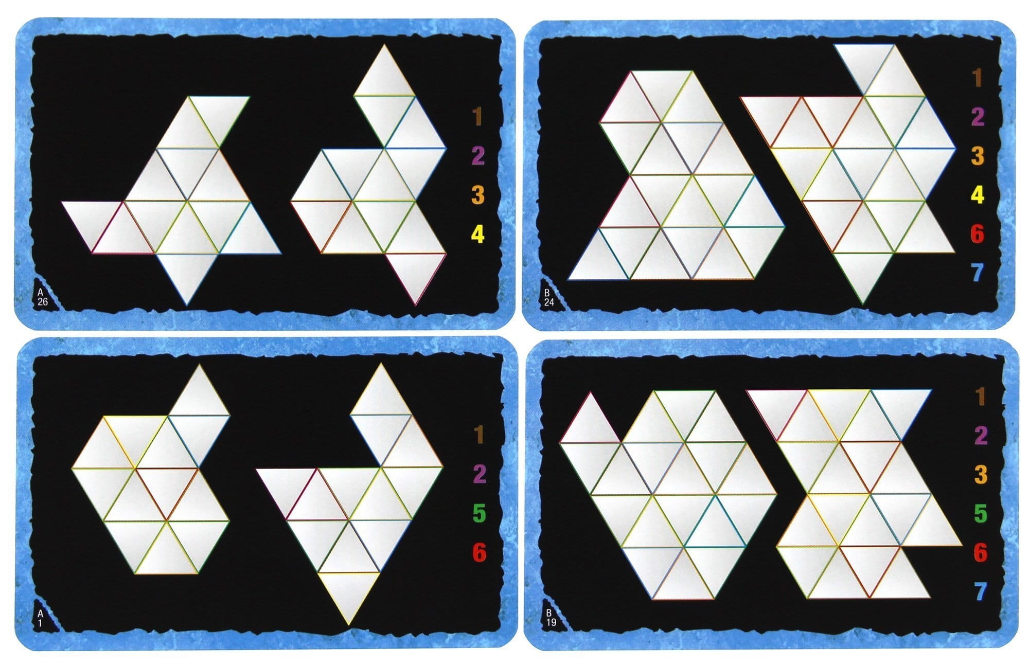 Kształty kafelków w Ubongo Trigo, jak sama nazwa gry mówi, związane są z trójkątami. Daje to nowe możliwości wzorów i kolejne zadania na kartach, które pobudzą wasze szare komórki do działania!
