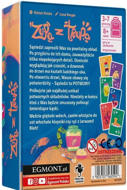 "Zupa z trupa", to wciągająca gra familijna, w której gracze starają się pozbywać kart, aby uniknąć lub zebrać jak najmniej punktów karnych. Cała gra składa się z talii złożonej ze 100. kart, co czyni ją idealną opcją na wyjazdy.