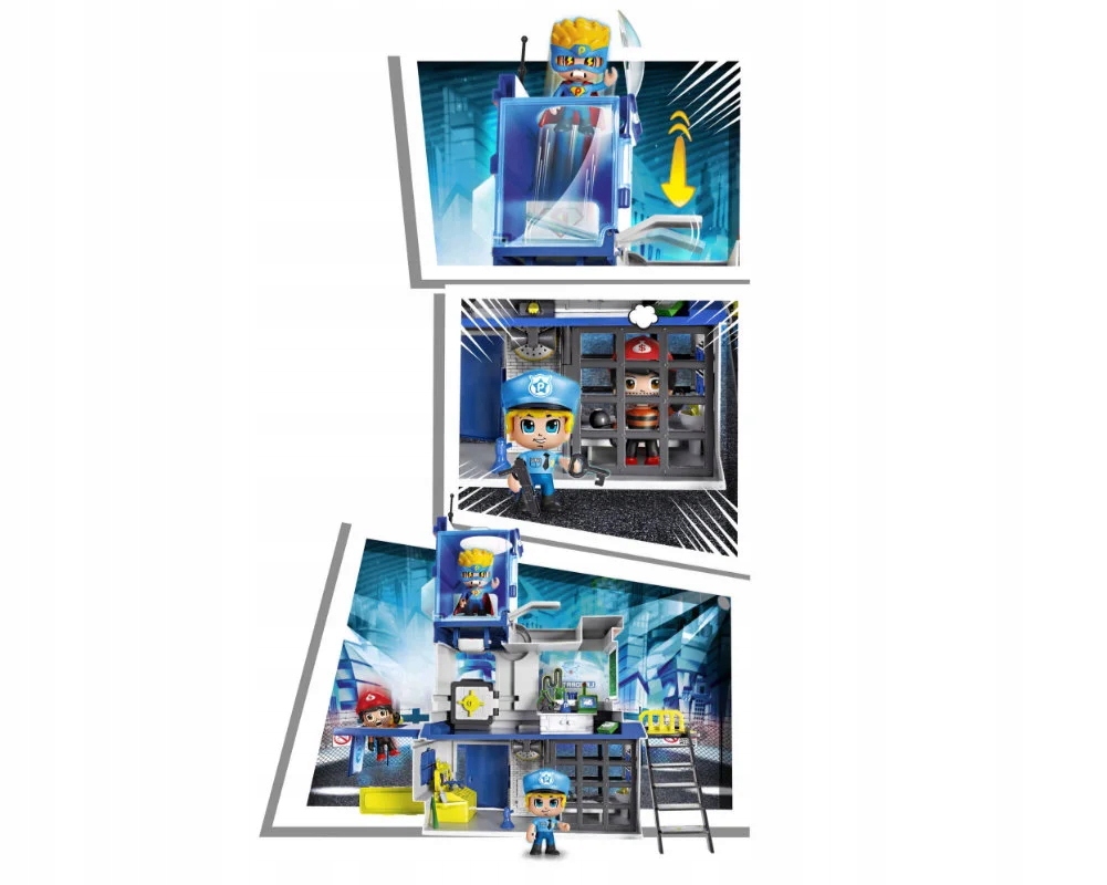 Model komisariatu wykonany z solidnego tworzywa będzie wspaniałym tłem do zabawy w policjantów i złodziei. Akcesoria i ciekawe funkcje takie jak sejf, syrena alarmowa, katapulta dla figurki, laboratorium z możliwością "wybicia szyby" zagwarantują długie godziny kreatywnej zabawy.