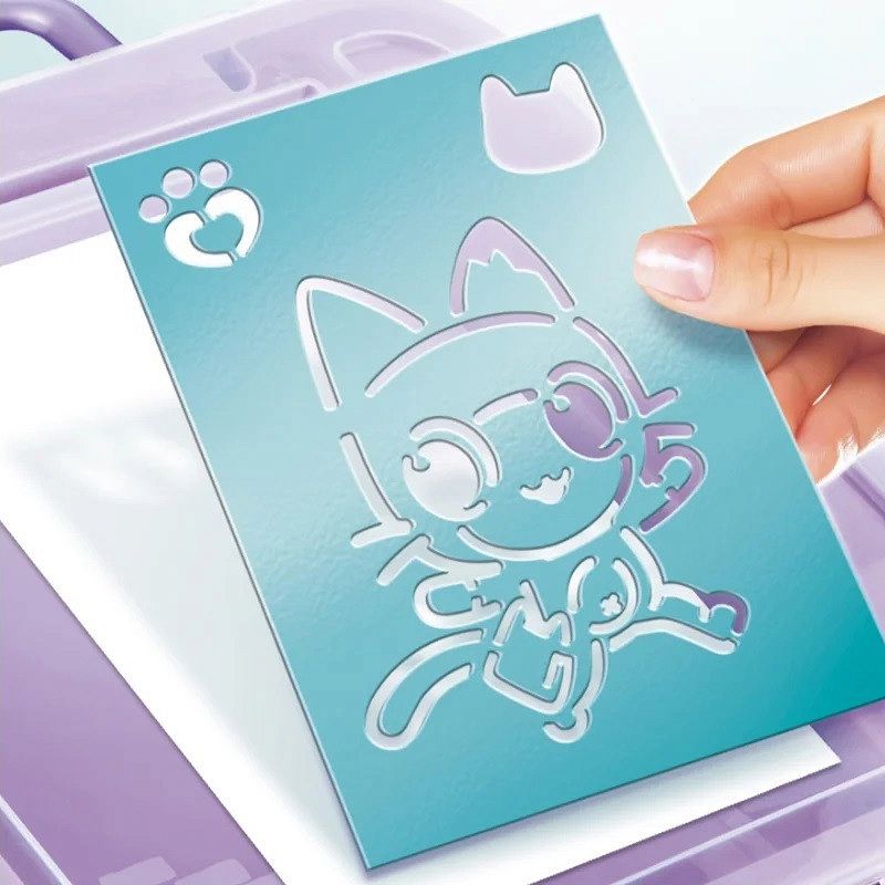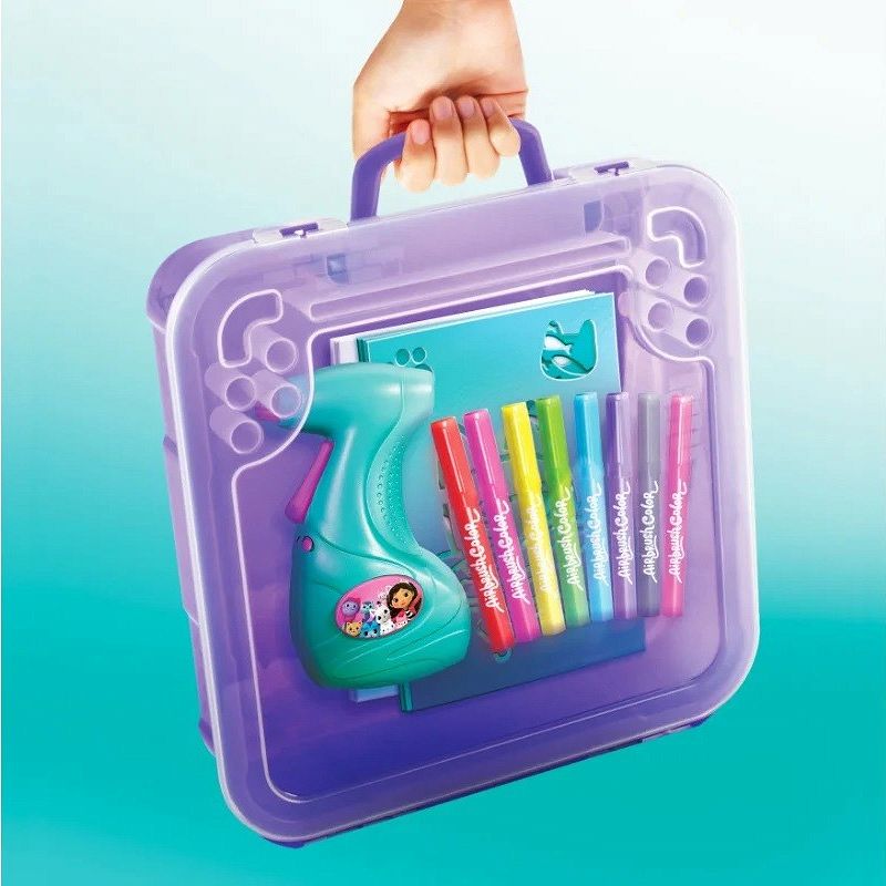 Poręczne pudełeczko z rączką zawiera wszystko, co jest potrzebne do kreowania wspaniałych projektów - aerograf, specjalne markery, szablony i kolorowe naklejki.