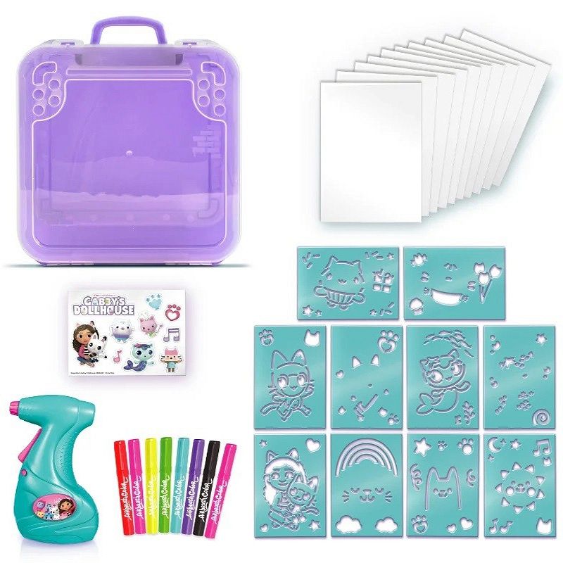 Zawartość zestawu: walizeczka, aerograf, 8 x marker do aerografu, 10 x szablon, 10 x arkusz papieru, arkusz naklejek.