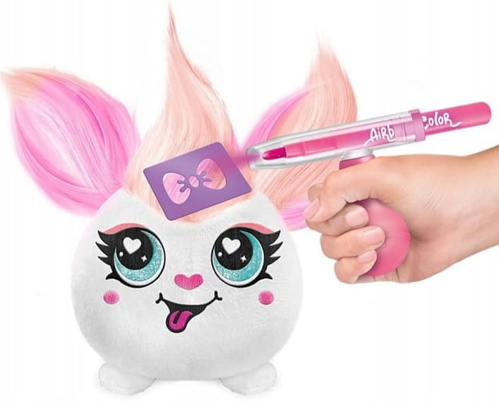"Iskierka" ma różowo-brzoskwiniowe włosy, duże błękitne oczy i zabawnie wystawiony język. Możesz ozdabiać zarówno włosy jak i pluszowe ciało maskotki, tworząc za pomocą aerografu odjazdowe makijaże.