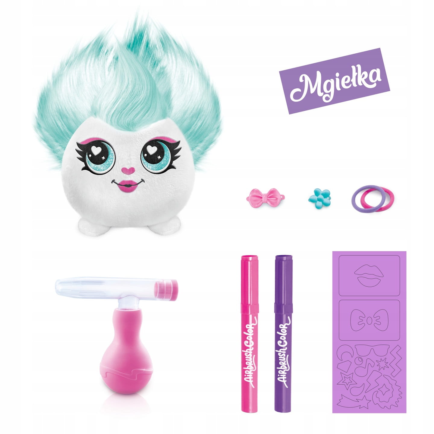 "Mgiełka" ma czuprynę w kolorze blado niebieskim z białym cieniowaniem. Długie włosy i puszyste białe ciało wyglądają jak zabawna chmurka. Pluszak ma duże niebieskie oczy, a różowe usta ułożone są jakby Mgiełka dawała całusy!
