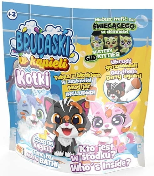 W saszetce znajdziesz jedną losową figurkę kotka - brudaska oraz kąpielowy atrybut. Jeśli będziesz mieć szczęście może trafisz wyjątkową wersję kotka świecącego w ciemności!