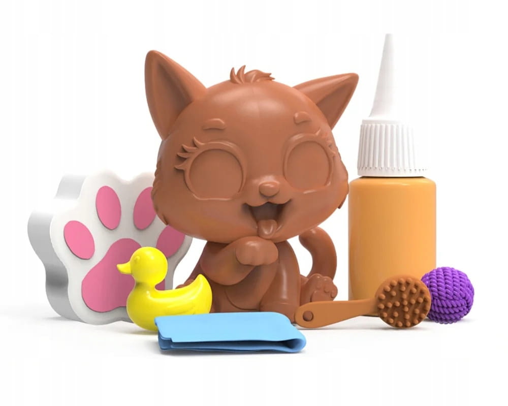 Ma pomarańczowe futerko z białym brzuszkiem oraz brązową grzywkę. Oprócz figurki Brudaska, w opakowaniu znajdziesz butelkę z błotkiem oraz zestaw kąpielowych akcesoriów dla kotka.