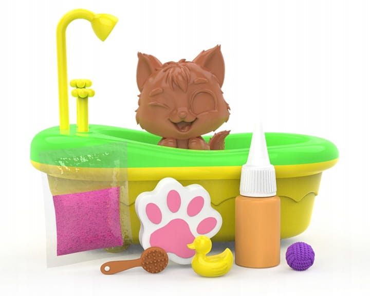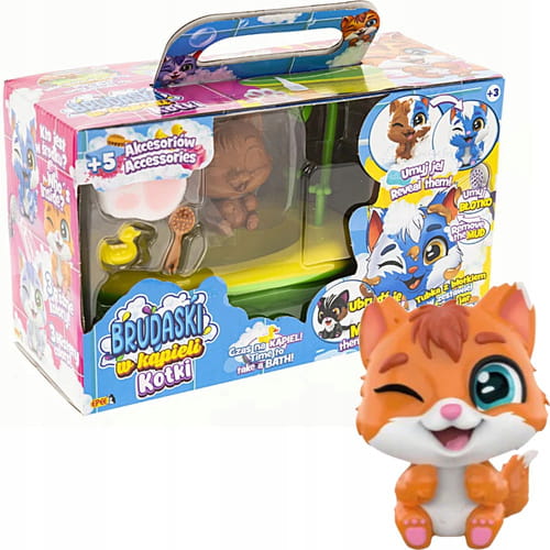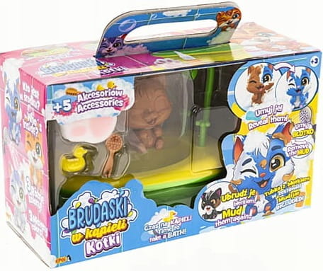 Urocze kociaki można brudzić dołączonym specjalnym błotkiem, a następnie przygotować im pachnącą kąpiel z pianą i zadbać o czystość. Fantastyczna i angażująca zabawa bez końca!