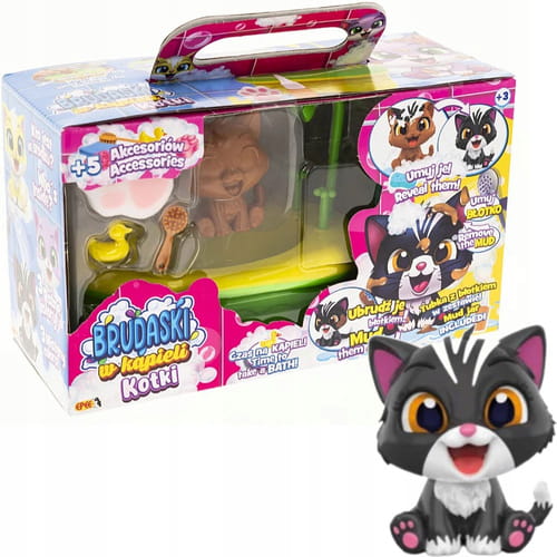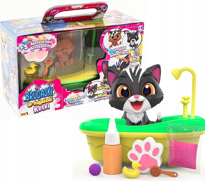 Urocze kociaki można brudzić dołączonym specjalnym błotkiem, a następnie przygotować im pachnącą kąpiel z pianą i zadbać o czystość. Fantastyczna i angażująca zabawa bez końca!