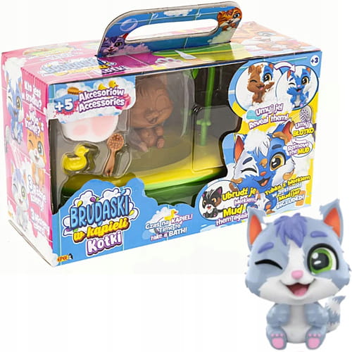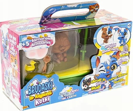 Urocze kociaki można brudzić dołączonym specjalnym błotkiem, a następnie przygotować im pachnącą kąpiel z pianą i zadbać o czystość. Fantastyczna i angażująca zabawa bez końca!