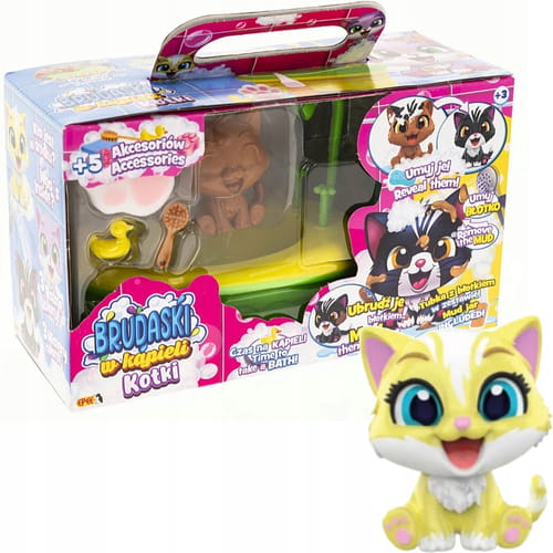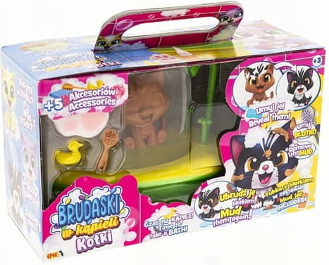 Urocze kociaki można brudzić dołączonym specjalnym błotkiem, a następnie przygotować im pachnącą kąpiel z pianą i zadbać o czystość. Fantastyczna i angażująca zabawa bez końca!