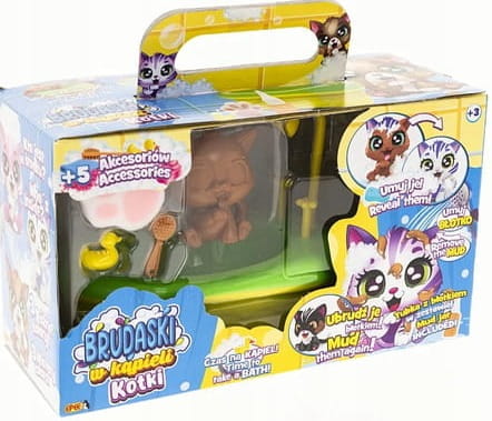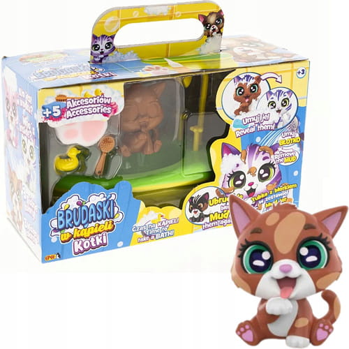 Urocze kociaki można brudzić dołączonym specjalnym błotkiem, a następnie przygotować im pachnącą kąpiel z pianą i zadbać o czystość. Fantastyczna i angażująca zabawa bez końca!