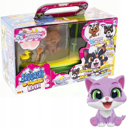 Urocze kociaki można brudzić dołączonym specjalnym błotkiem, a następnie przygotować im pachnącą kąpiel z pianą i zadbać o czystość. Fantastyczna i angażująca zabawa bez końca!
