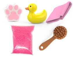 - 5 akcesoriów kąpielowych: ręczniczek, kaczuszka, szczotka, gąbeczka, sól kąpielowa