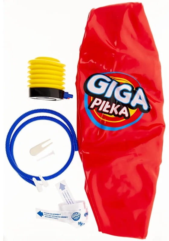 W opakowaniu znajdziesz czerwoną Gigapiłkę, taśmę pomiarową oraz pompkę.