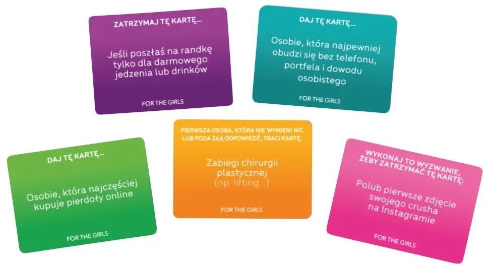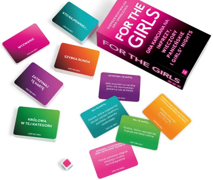 For The Girls to idealna gra na wieczór panieński, domówkę z przyjaciółkami, urodziny, spotkanie po latach czy babską imprezę w akademiku. Sprawdzi się zarówno podczas posiadówki w domu, jak i jako emocjonująca rozgrzewka przed wyjściem na miasto!