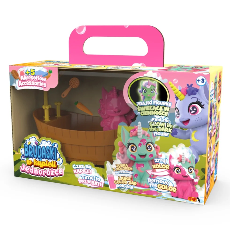 Urocze jednorożce można brudzić dołączonym specjalnym błotkiem, a następnie przygotować im pachnącą kąpiel z pianą i zadbać o czystość. Fantastyczna i angażująca zabawa bez końca!