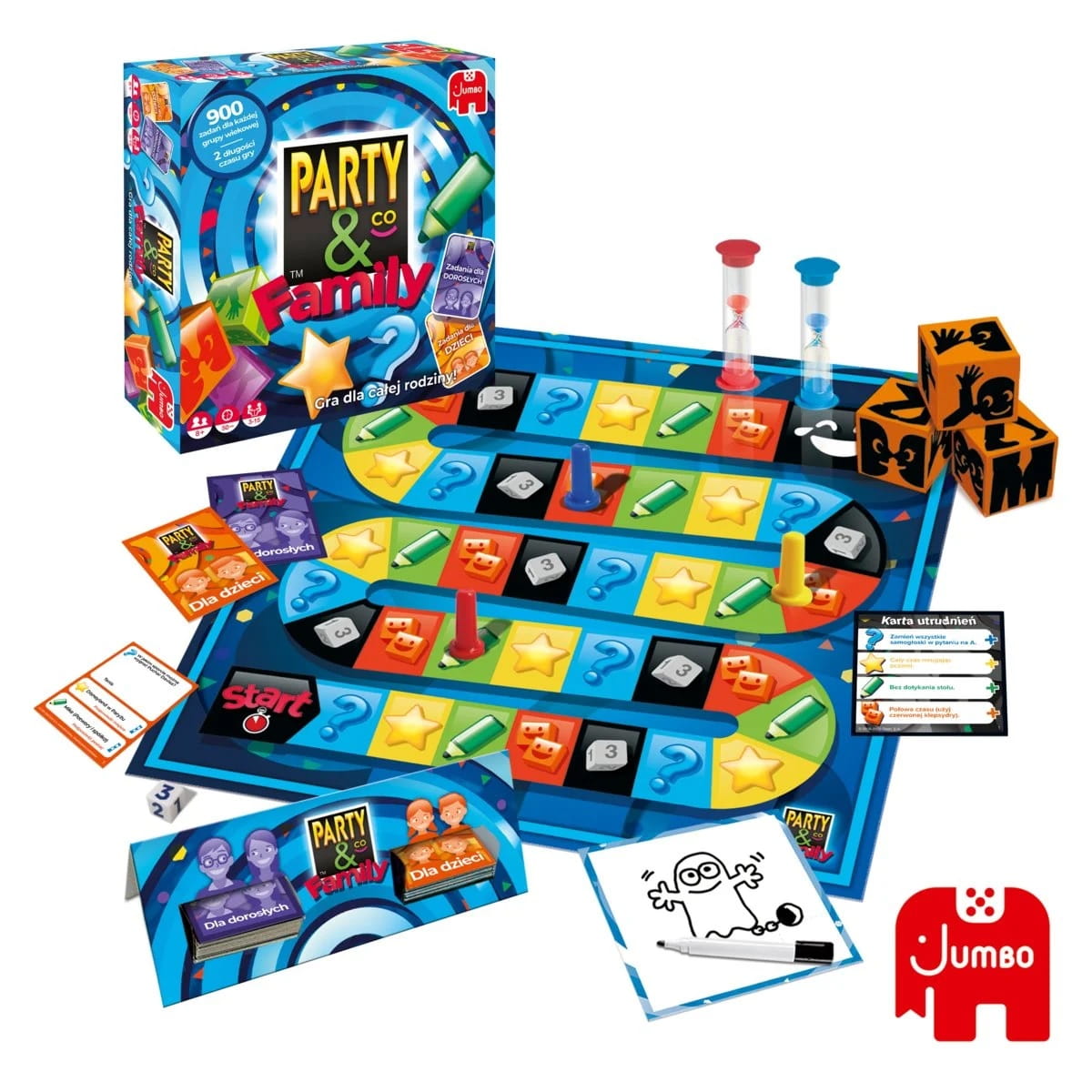 Party & Co.™ FAMILY: to super zabawa dla całej rodziny! Spędź fantastyczny czas z tą nową grą familijną. Naśladuj, rysuj, przybieraj szalone pozy, odpowiadaj na ciekawe pytania i mierz się z nieoczekiwanymi utrudnieniami. 2 długości czasu gry i 900 zadań dla każdej grupy wiekowej - czekają Cię godziny wspaniałej zabawy! Zawartość pudełka: dwustronna plansza do gry, 300 kart (150 dla dzieci i 150 dla dorosłych), 3 kostki Partycubes, dwustronna plansza Partyboard, zmywalny flamaster, 2 klepsydry, 3 pionki, kostka do gry, 12 kart utrudnień, zasady gry. Gra dla 3 do 15 osób w wieku 8+, jedna rozgrywka trwa od 25 do 50 minut. Gra nie wymaga baterii.
