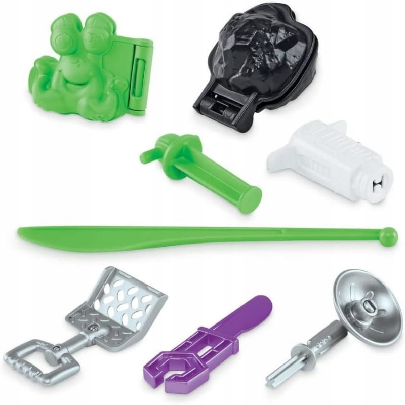 W zestawie znajduje się również kosmiczny łazik, który posiada stemple w kształcie planet. W komplecie znajdziesz również formy, które pozwalają modelować obce istoty i meteoryty, a także tematyczne akcesoria, takie jak satelita czy flaga kosmiczna.