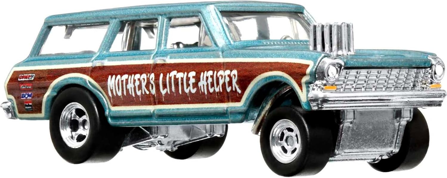 Chevrolet Nova Gasser z 64. roku, to amerykański klasyk w wyścigowym stylu z serii Hot Wheels Premium. Model zachwyca masywną sylwetką, kontrastową kolorystyką i dopracowanymi detalami inspirowanymi drag racingiem. Auto wykonane jest w całości z metalu, wyposażone w gumowe opony Real Riders oraz realistyczne wykończenie nadwozia z charakterystycznym motywem „Mother’s Little Helper”. Podniesiony przód i detale silnika podkreślają jego wyścigowy charakter.