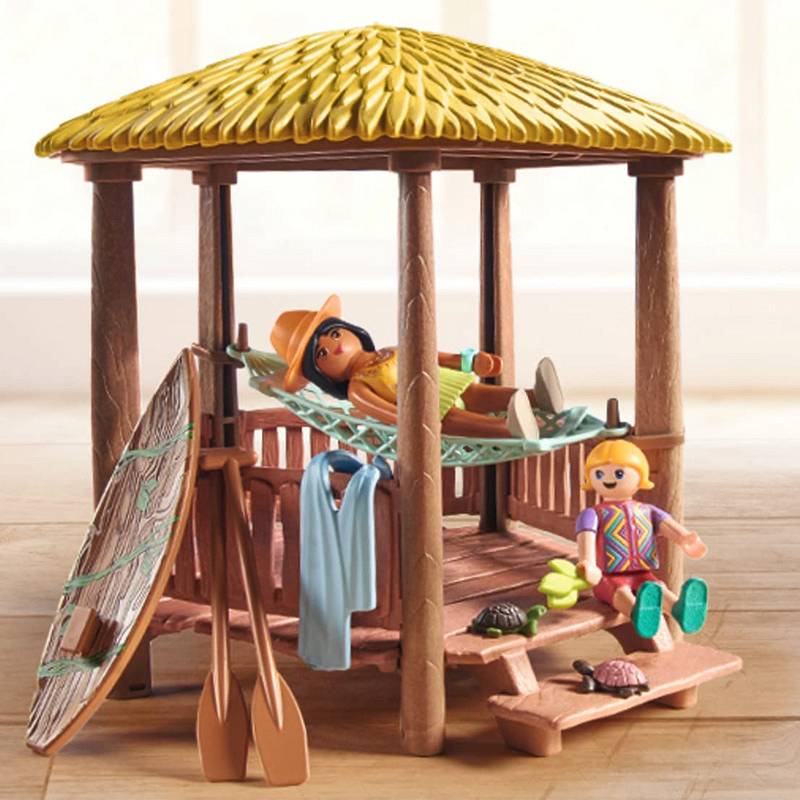 Zestaw zawiera dwie figurki PLAYMOBIL, delfina rzecznego z dzieckiem, żółwia z niemowlętami, dwie deski SUP z wiosłami oraz chatkę z hamakiem i wiele innych wspaniałych dodatków. Z nowym rozmiarem figury dla dzieci o wzroście 5,75 cm.