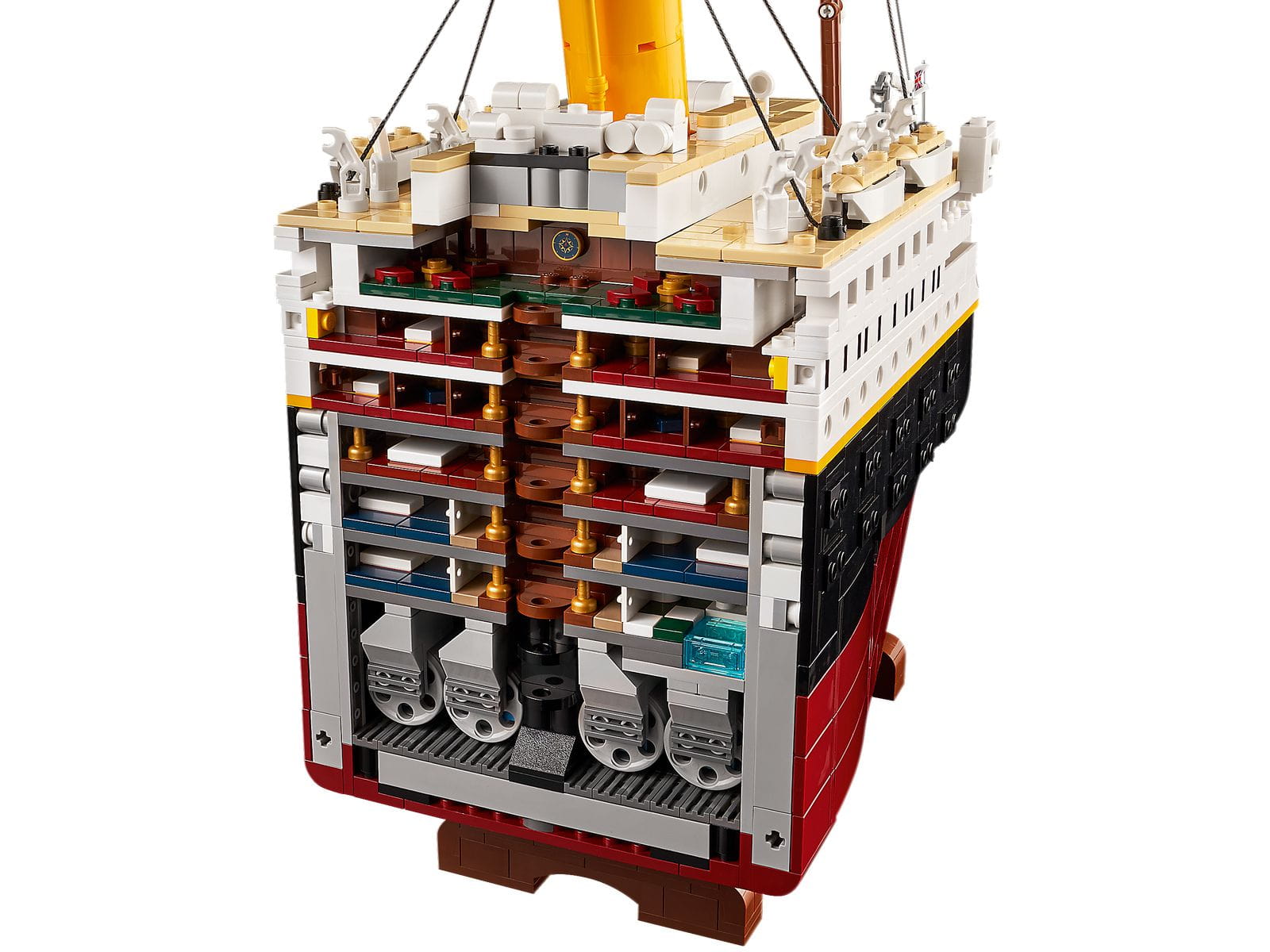 - Statek dzieli się na trzy sekcje, więc można zajrzeć do środka. Gdy go zbudujesz, będzie można podziwiać wspaniałe schody, kabiny, jadalnię, palarnię, czytelnię oraz basen.