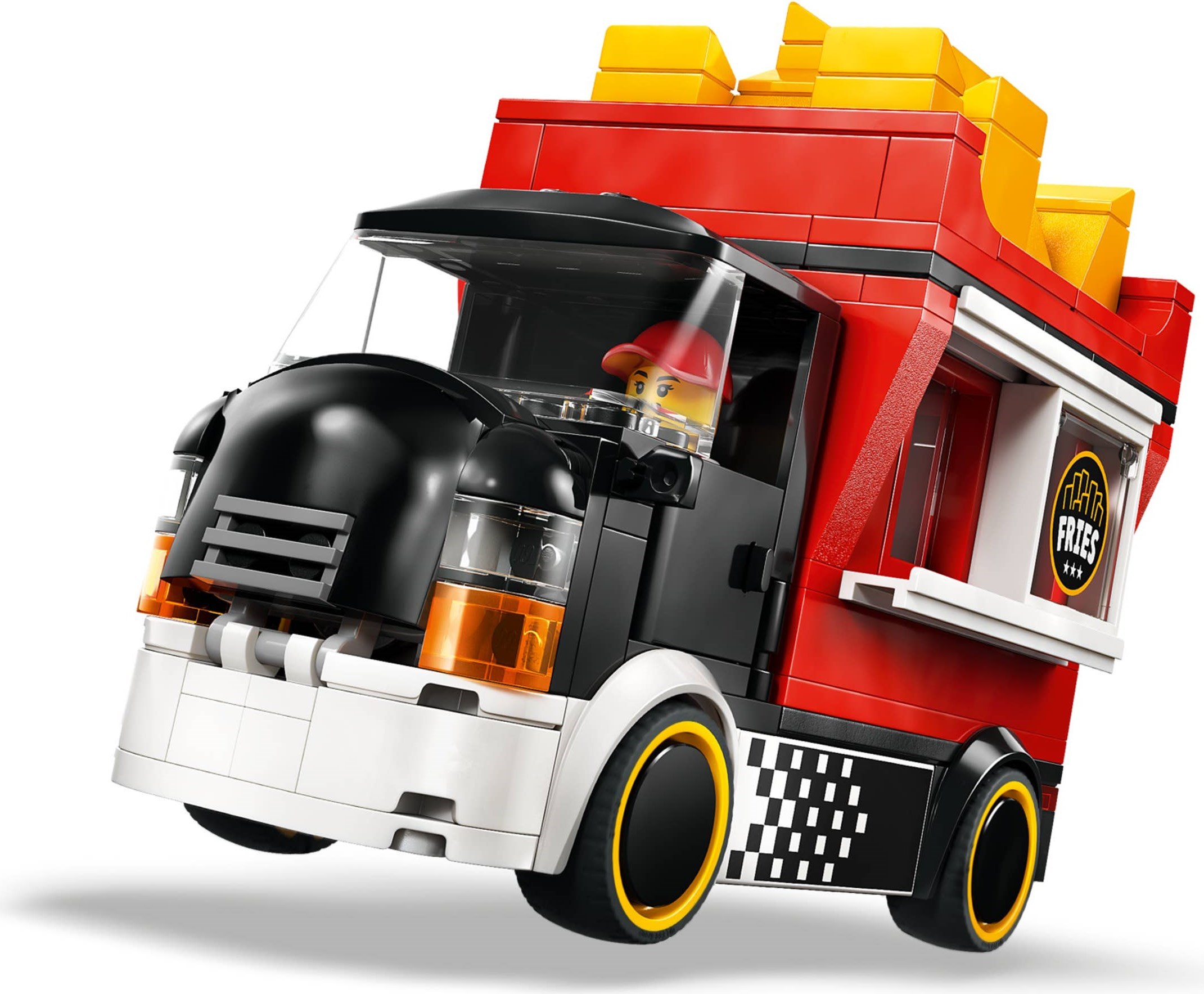 Kolorowy food truck wyposażony jest w odczepiany kiosk w kształcie wielkiej porcji frytek. Dzieci mogą zdjąć dach, aby uzyskać dostęp do szczegółowej strefy przygotowywania posiłków, wyposażonej we frytkownicę, przyprawy i przesuwane okienko do obsługi klientów. Ten model food trucka ma również otwieraną maskę z zabawkowym silnikiem oraz minifigurki sprzedawcy i klienta.