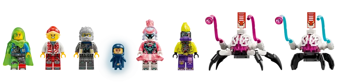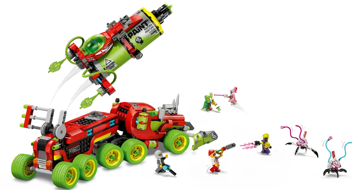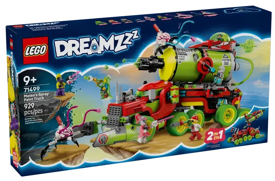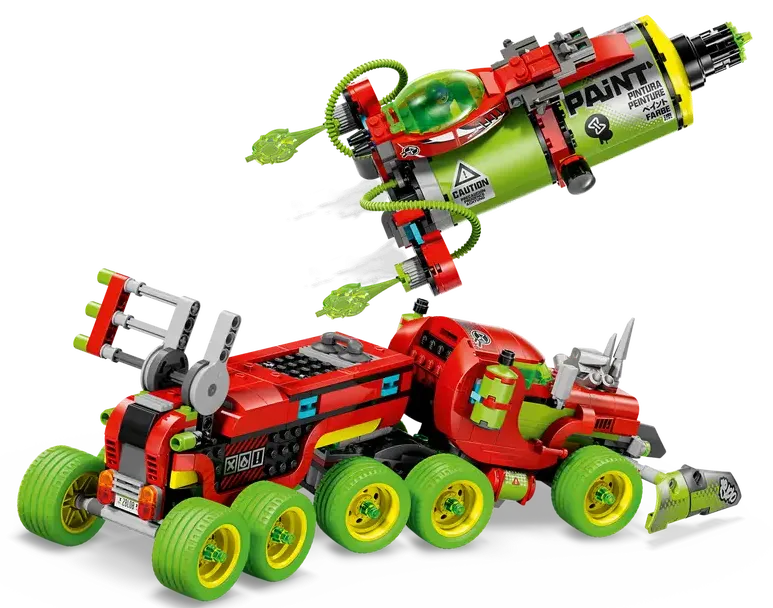 W zestawie mamy ciężarówkę, którą możemy złożyć na dwa różne sposoby. Możemy ułożyć puszkę sprayu lub wyrzutnię rakiet. Dodatkowo zestaw posiada wiele ciekawych detali takich jak miotacze klocków, otwierany kokpit oraz modułowe miotacze i puszki sprayu, które są kompatybilne z innymi zestawami z serii LEGO DREAMZzz z 2025 roku (sprzedawanymi osobno). Zestaw zawiera również Mateo, Coopera, Pana Oza, Alberta, One, D-Shocka i dwa cyberpająki-mózgowce, które pobudzają wyobraźnię do odgrywania ról.