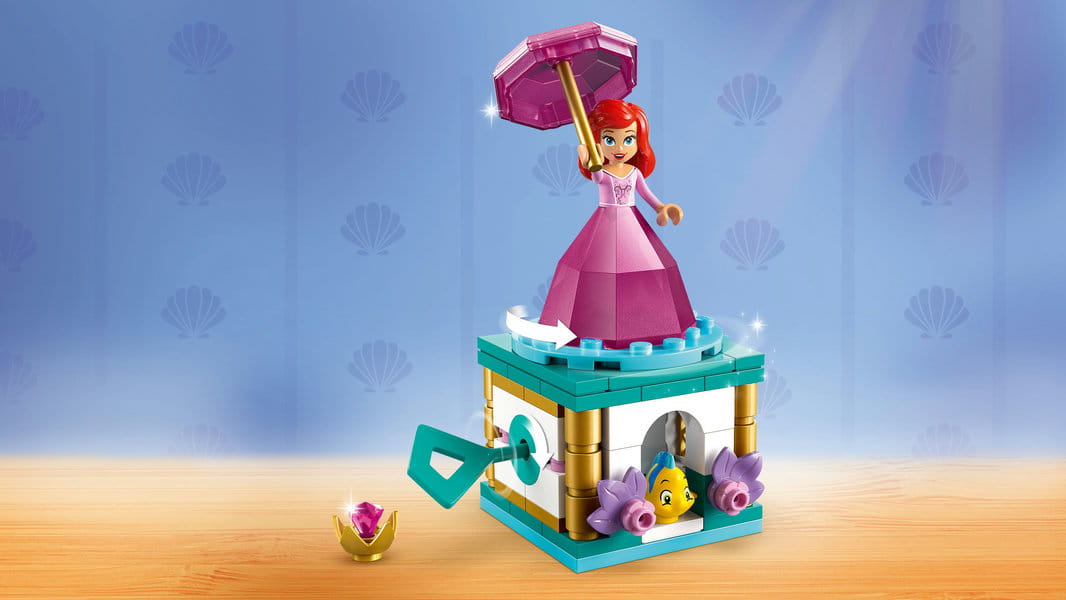 Niewielki zestaw z serii LEGO Disney, dostarczy wiele radości fanom "Małej syrenki". Odkryj ile niespodzianek skrywa ten model. Zaczynając od purpurowego diamentu, wyjmij Arielkę ze środka i zamień kryształ w piękną suknię balową. Ustaw figurkę na podstawie szkatułki i przekręć klucz. Arielka trzymając w jednej dłoni parasol, a w drugiej widelec, zaczyna delikatnie wirować w tańcu.