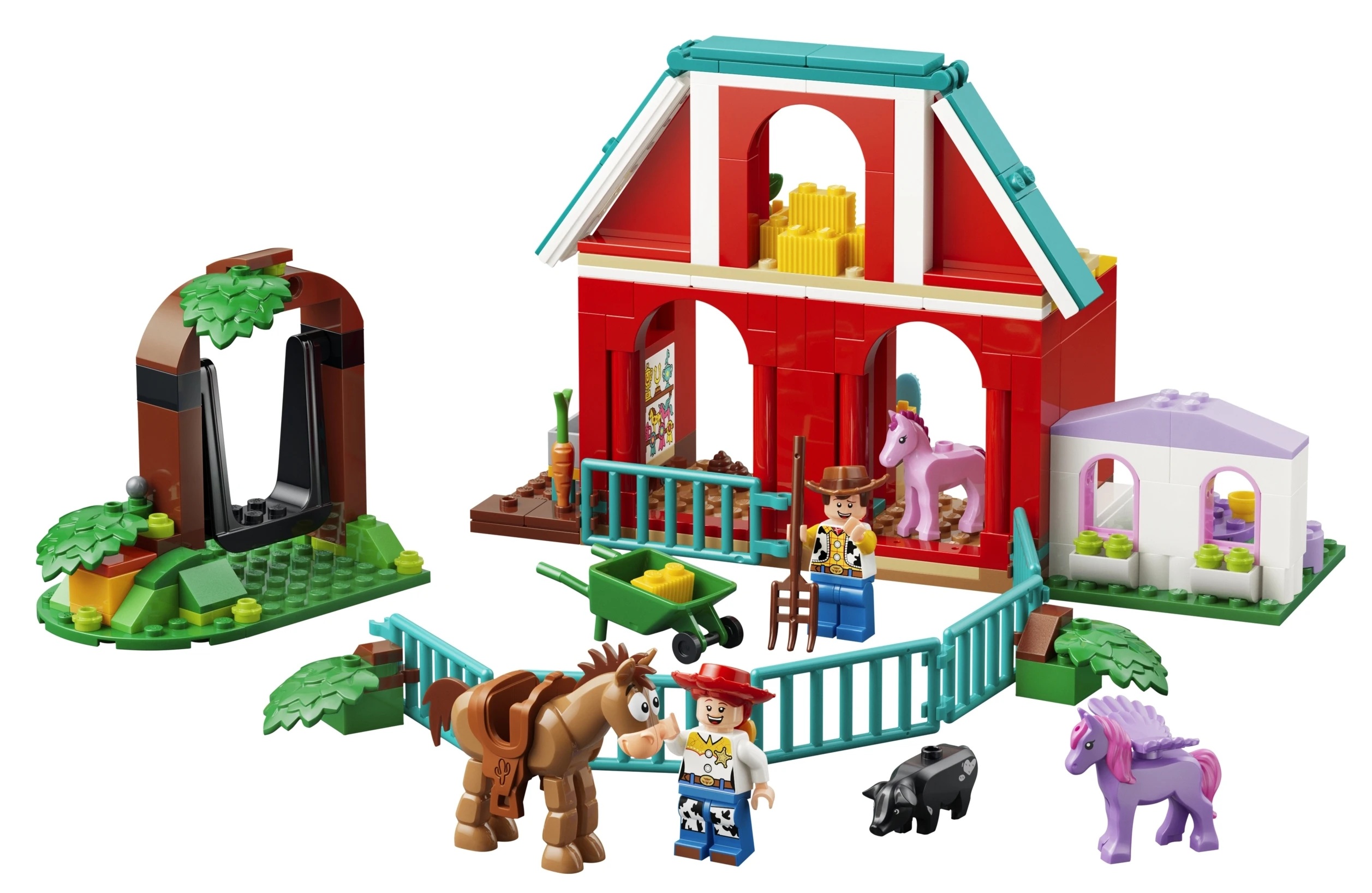 Ten zestaw klocków ze stodołą, inspirowany filmem Toy Story 5, zachęca do zabawy sześcioma minifigurkami Chudego i Jessie, koniem Mustangiem, świnką Blaze'a, kucykiem i skrzydlatym koniem. Jest też stodoła z bramami, strych na siano, domek do zabawy, grządka warzywna i poidło, a także huśtawka na drzewie z ukrytą kapsułą czasu. Ta zabawka konstrukcyjna dla dzieci w wieku od czterech lat to ciekawy pomysł na prezent w stylu Toy Story! Zbuduj model razem z innymi zabawkami konstrukcyjnymi LEGO Disney (sprzedawanymi osobno), aby zachęcić dzieci do zabawy. Zawiera kolorowe ilustrowane instrukcje, duże klocki startowe oraz osobne woreczki zawierające po jednym modelu z klocków, dzięki czemu budowanie jest szybkie i przyjemne.