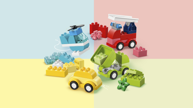 Opakowanie zawiera wiele klocków, elementów i ruchomych funkcji, które pobudzą kreatywność maluchów! Najpierw maluchy budują główne modele LEGO Duplo: helikopter z obracającym się wirnikiem, wywrotkę z wychylaną naczepą, wozu strażackiego z drabiną na zawiasach oraz mały rodzinny samochód.
