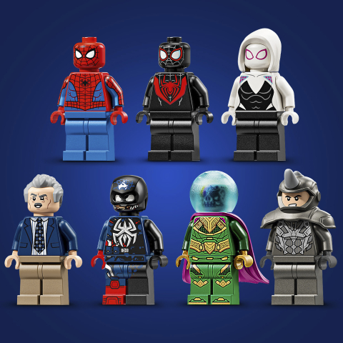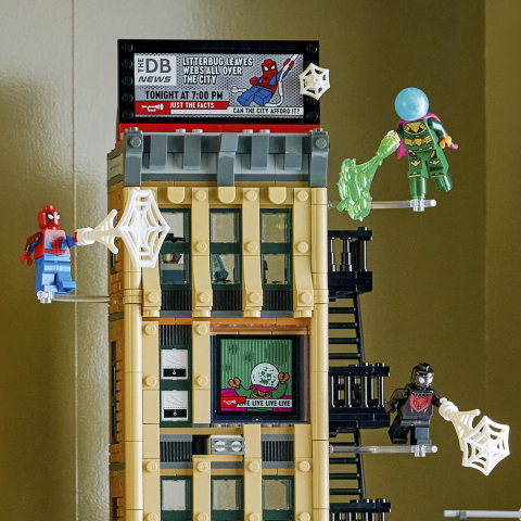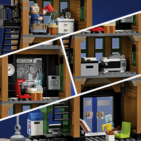 Odkryj cztery piętra pełne akcji superbohaterów w zestawie Spider-Man kontra Mysterio: Daily Bugle. Ten kolekcjonerski zestaw konstrukcyjny ze Spider-Manem, który można budować, bawić się nim i ustawiać na półce, jest pełen mini figurek i przygód do odgrywania. Zestaw zawiera mini figurki Spider-Mana, Milesa Moralesa, Ghost Spidera, J. Jonah Jamesona, Mysterio, zvenomizowanego Kapitana Amerykę i Rhino, a także trzy przezroczyste patyczki i dwa przezroczyste klocki, które umożliwiają tworzenie scen akcji w powietrzu. W zestawie znajduje się też ruchomy mech Rhino z otwieranym kokpitem. Szczegółowe wnętrze obejmuje biura, recepcję, zaplecze techniczne redakcji, sejf na gotówkę oraz działającą dźwignię do zmiany billboardów. Na zewnątrz znajduje się wyjście przeciwpożarowe, ruchomy kiosk z gazetami oraz róg ulicy z sygnalizacją świetlną.
