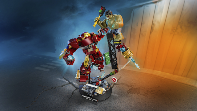 Odegraj akcję z filmu „Avengers: Czas Ultrona” dzięki temu niesamowitemu zestawowi. Zawiera on minifigurki Iron Mana i Hulka oraz kultową zbroję Hulkbuster, która daje dzieciom nieograniczone możliwości kreatywnej zabawy i budowania. Iron Man walczy z Hulkiem, korzystając z pomocy swojej zbroi Hulkbuster, na ulicy pełnej gruzu, zawalonych konstrukcji stalowych i sygnalizacji świetlnej, którą Hulk może wykorzystać jako broń. Hulkbuster jest w pełni ruchomy, co poszerza możliwości ustawiania figurki. Dzięki solidnej podstawce i płytce możesz wykorzystać swój model jako dekorację pokoju lub odłączyć mini figurki, aby odgrywać własne przygody superbohaterów.