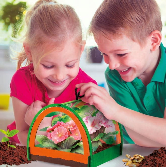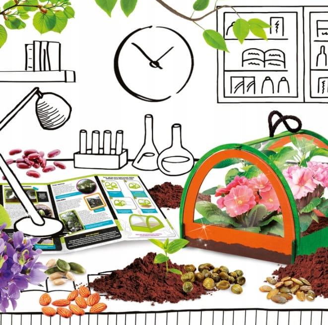 W praktyczny sposób poznają zasady uprawy roślin, pielęgnacji i cyklu życia roślin. Dołączone do opakowania mini szklarnia oraz zestaw różnych roślin pozwala na szybkie rozpoczęcie zabawy w małego ogrodnika.
