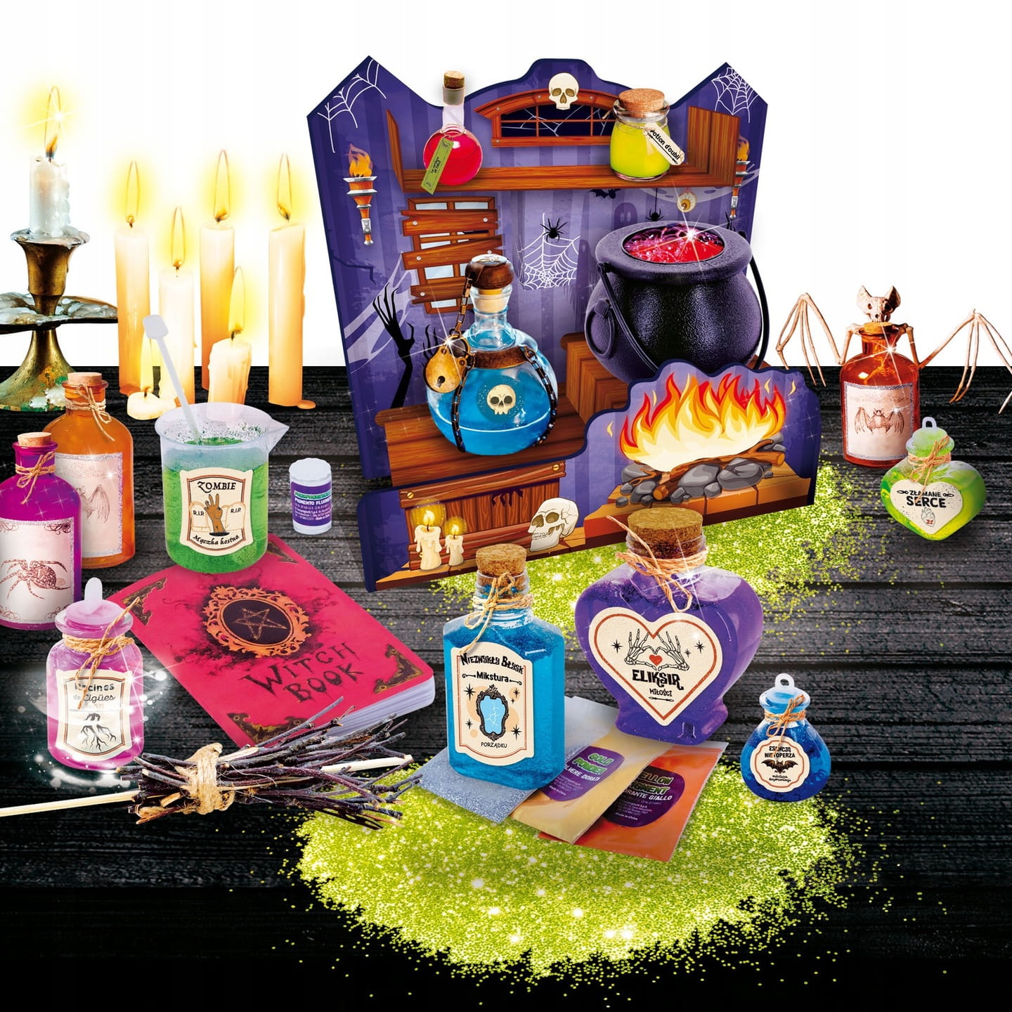 Pod czarnym pękatym kociołkiem już tli się ogień. W środku buzuje tajemniczy wywar... Regał ugina się od flakoników z kolorowymi miksturami. Patrz! Czy jeden z nich właśnie zaczął świecić w ciemności? W powietrzu unosi się magia!