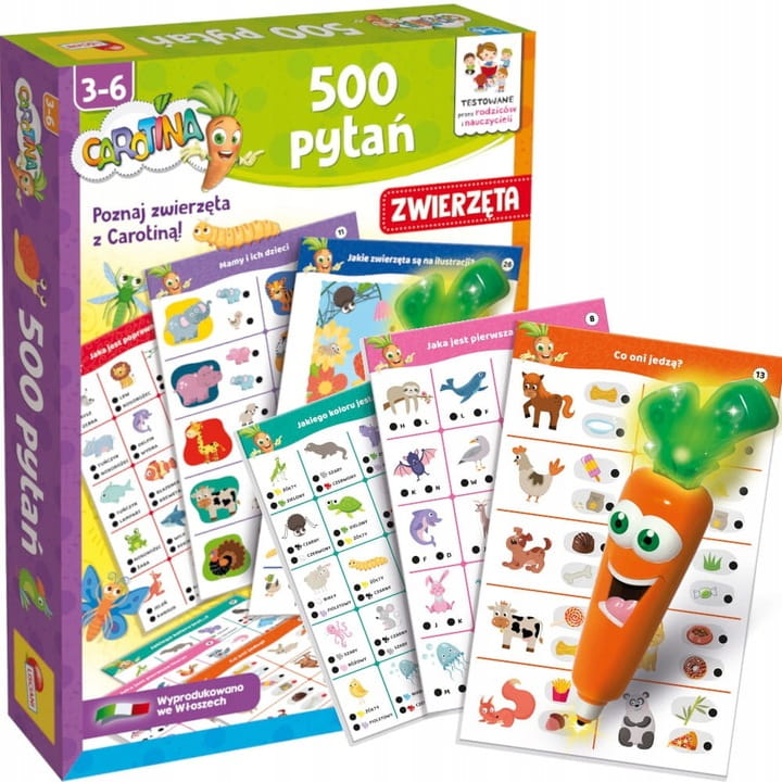 Jesteście ciekawi świata zwierząt? Edukacyjna gra z interaktywnym długopisem-marchewką to aż 500 pytań o tematyce zwierząt! Duże kolorowe karty z obrazkami uczą maluchy słownictwa, skojarzeń i spostrzegawczości, utrwalając prawidłowe odpowiedzi za pomocą komunikatu i światełka w długopisie.