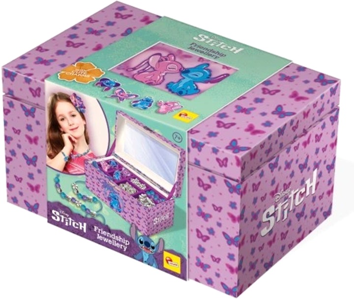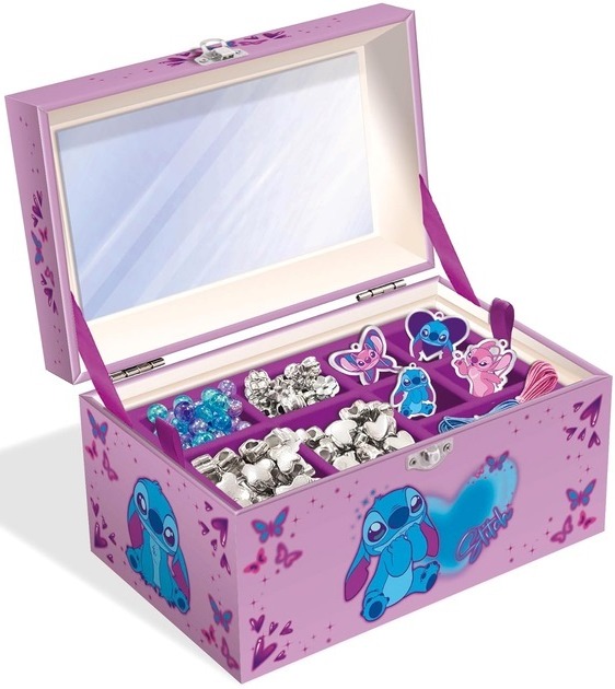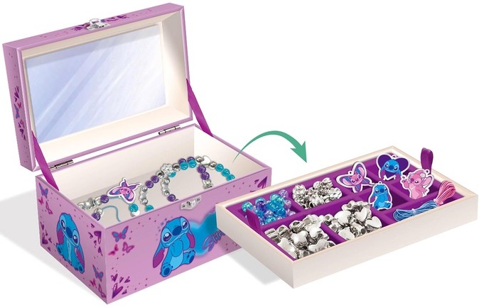 Zestaw kreatywny dla dzieci, dzięki któremu mogą tworzyć unikalne naszyjniki i bransoletki z koralików, zawieszek, drucików i akcesoriów. Dołączone do zestawu wspaniałe pudełko na biżuterię Stitch ma wyjmowaną przegródkę, lusterko i metalowe zapięcie. Jest idealne do przechowywania i ochrony swoich dzieł.
