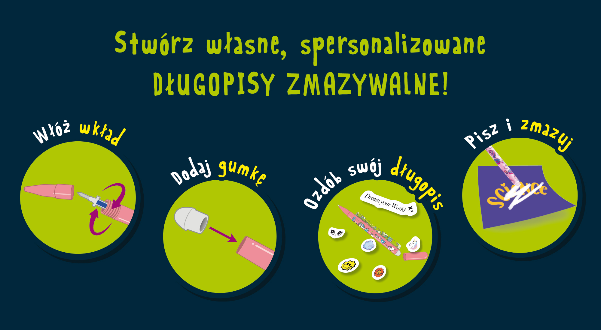 Wyjątkowo kreatywny zestaw, który za sprawą eksperymentów z tuszem pozwala na stworzenie własnych, kolorowych i wymazywalnych długopisów! Opakowanie zawiera również wiele naklejek, które pozwolą na ich spersonalizowanie oraz wyjątkowy pojemnik w kształcie kaktusa, w którym można przechowywać swoje dzieła.
