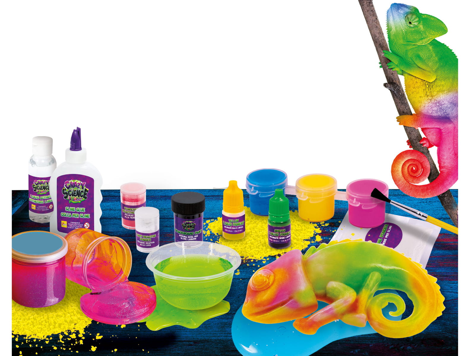 Stwórz wielobarwnego kameleona i zdecyduj jak będzie ostatecznie wyglądał. Użyj foremek, mieszaj kolory i poznaj ponad 50 różnych slime! Dodatkowo możesz stworzyć tablicę slime, do malowania po niej farbkami.