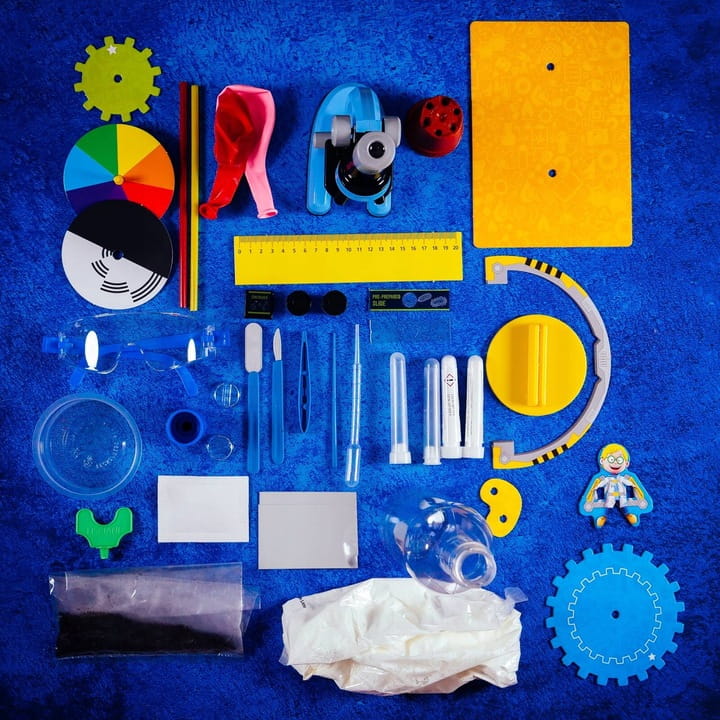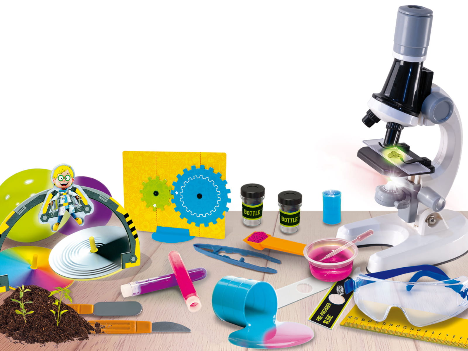 W środku można znaleźć takie elementy, jak mikroskop, gotowe szkiełko, szkiełko do przygotowywania, plastikowe części: pęsetę, szpatułkę i skalpel, a także wkręty, koła zębate, bączek i miska. Najmłodsi będą korzystali z reagentów chemicznych, probówek i klucza do ich otwierania, nasion i doniczek na nie, słomek oraz pipety.