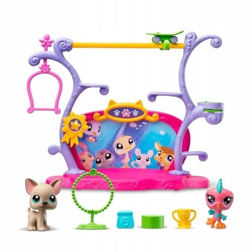 W tym zestawie dwójka małych uczestników przygotowuje się do pokazu talentów. To będzie niezapomniane show! Ustaw scenę ze wszystkimi akcesoriami i patrz jak szczeniaczek oraz mała papuga wykonują akrobacje i triki zaskakując publiczność. Finałowym popisem jest przejazd na deskorolce po linie, rozpiętej wysoko nad sceną. Emocje gwarantowane!