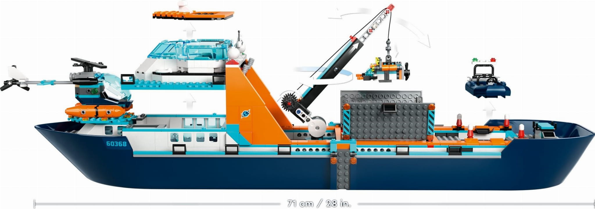 Na horyzoncie czekają na Ciebie świetne przygody dzięki potężnej łodzi badacza Arktyki LEGO® City (60368). Ta ogromna, unosząca się na wodzie łódź ma mnóstwo realistycznych detali, które pomogą wymyślać pomysłowe wyprawy badawcze. Ten zestaw zawiera również helikopter, ponton, zdalną łódź podwodną i wrak statku Wikingów, a także skrzynię ze skarbami, siedem minifigurek i figurkę orki.
