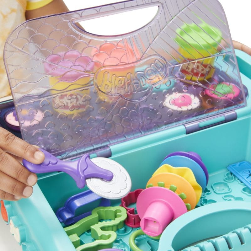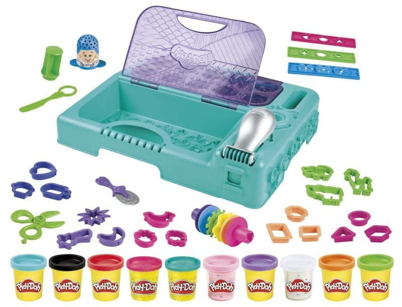 Zestaw "Super warsztat" to praktyczny zestaw z podstawką na kolorowe tuby, foremkami i szablonami do wykrajania i odciskania wzorów, a także radełko i wielofunkcyjny wałek. Całość to ponad 30 różnych akcesoriów w tym 10 tub z kolorową masą play-doh. Fani serii zabawek Play-Doh z pewnością rozpoznają dwa kultowe zestawy wbudowane w warsztat - Fryzjer oraz Fabryka zabawy.