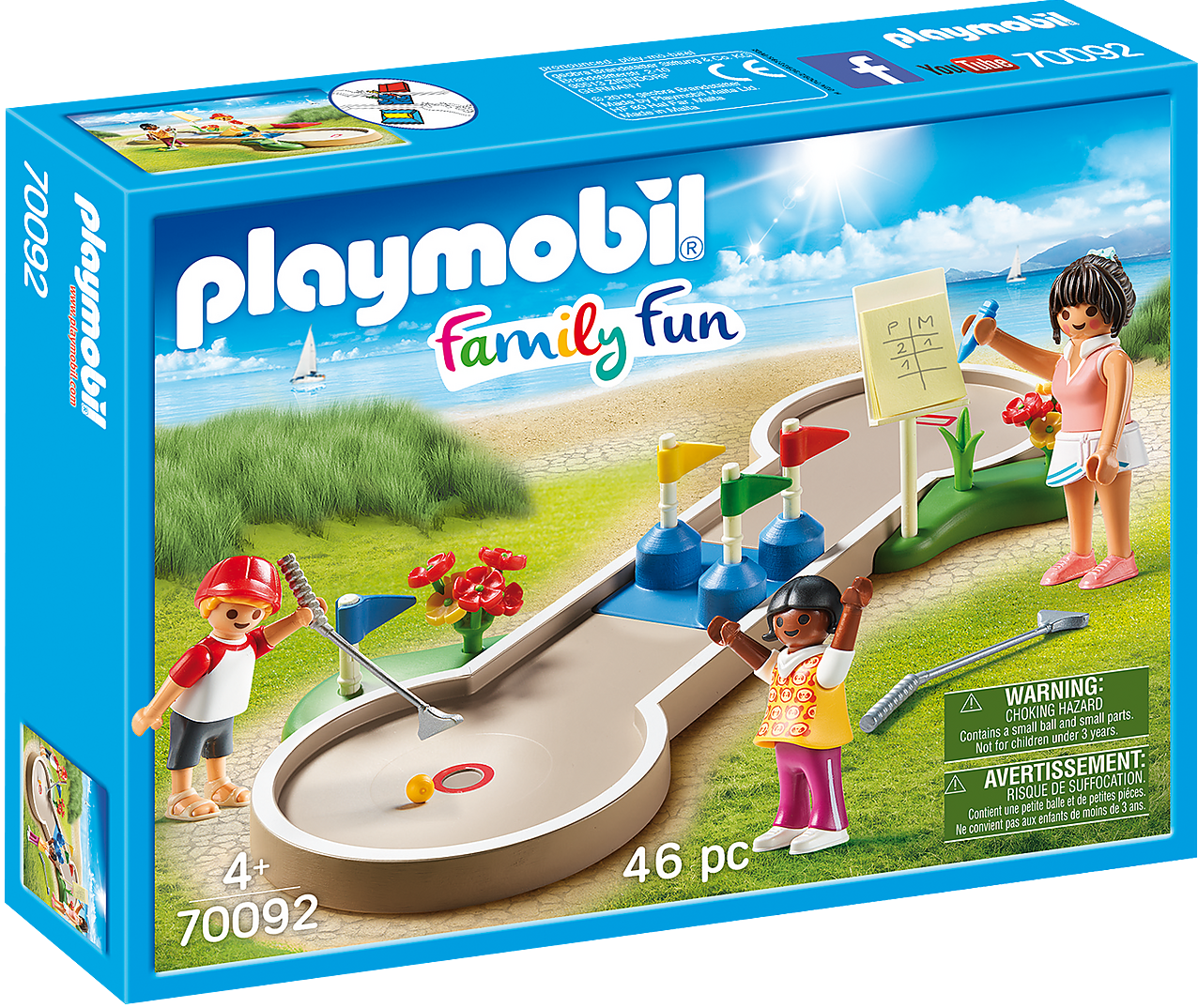 Zestaw zawiera 3 figurki, akcesoria tematyczne oraz pole do mini golfa.