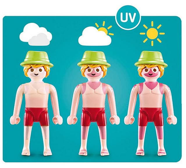 Pluskanie się w wodzie z kółkiem do pływania to świetna zabawa. Ale jeśli zapomnisz o ochronie przeciwsłonecznej, pod koniec dnia czeka cię niemiła niespodzianka: oparzenie słoneczne! Skóra plażowicza jest nie tylko zaczerwieniona, ale także spalona słońcem. Teraz czas wyjść ze słońca i nałożyć leczniczą maść. Na szczęście następnego dnia skóra wygląda znacznie lepiej. Od teraz wczasowicze zawsze będą myśleć o stosowaniu kremów przeciwsłonecznych! Pod wpływem światła UV części skóry dorosłej postaci stają się czerwone.