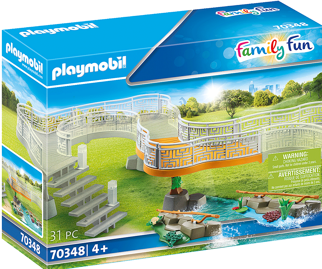Zestaw zawiera platformę widokową oraz elementy ogrodzenia wybiegów wraz z wodą i trawą. Jest to idealny zestaw do rozbudowy twojego ZOO.